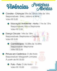 Cavalos – Crianças:10hs às 12hs e 14hs às 16hs