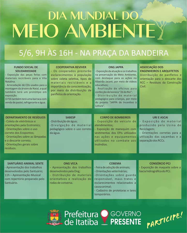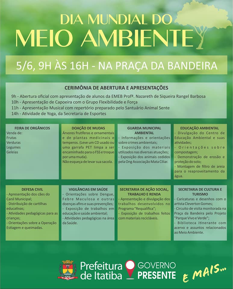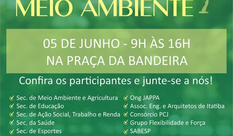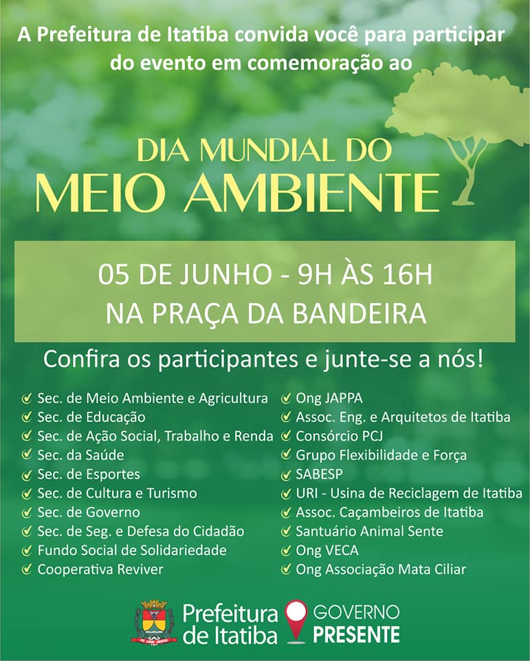 Anualmente, no dia 5 de junho, cidades do mundo inteiro se mobilizam para celebrar o Dia Mundial do Meio Ambiente e em Itatiba não será diferente. Mantendo as políticas de preservação do meio ambiente e conscientização de sua importância para a população a Prefeitura Municipal de Itatiba, por meio da Secretaria de Meio Ambiente e Agricultura promoverá em parceria com outras Secretarias Municipais, setores da administração pública e instituições da sociedade civil, ações especiais na Praça da Bandeira para celebrar a tão importante data.