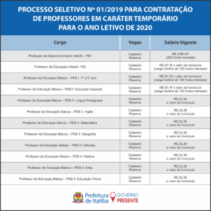 Estão abertas as inscrições para Processo Seletivo para contratação de professores em caráter temporário para o ano letivo de 2020. O concurso se realizará por meio do Instituto Zambini e as inscrições serão realizadas exclusivamente pela internet no período das 10 horas de 29 de outubro de 2019 às 23 horas de 25 de novembro de 2019, o candidato deverá seguir as instruções apresentadas no site www.zambini.org.br