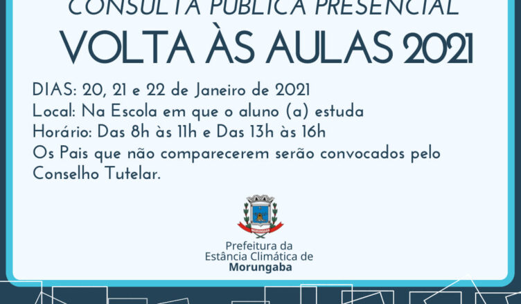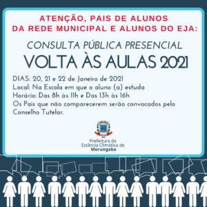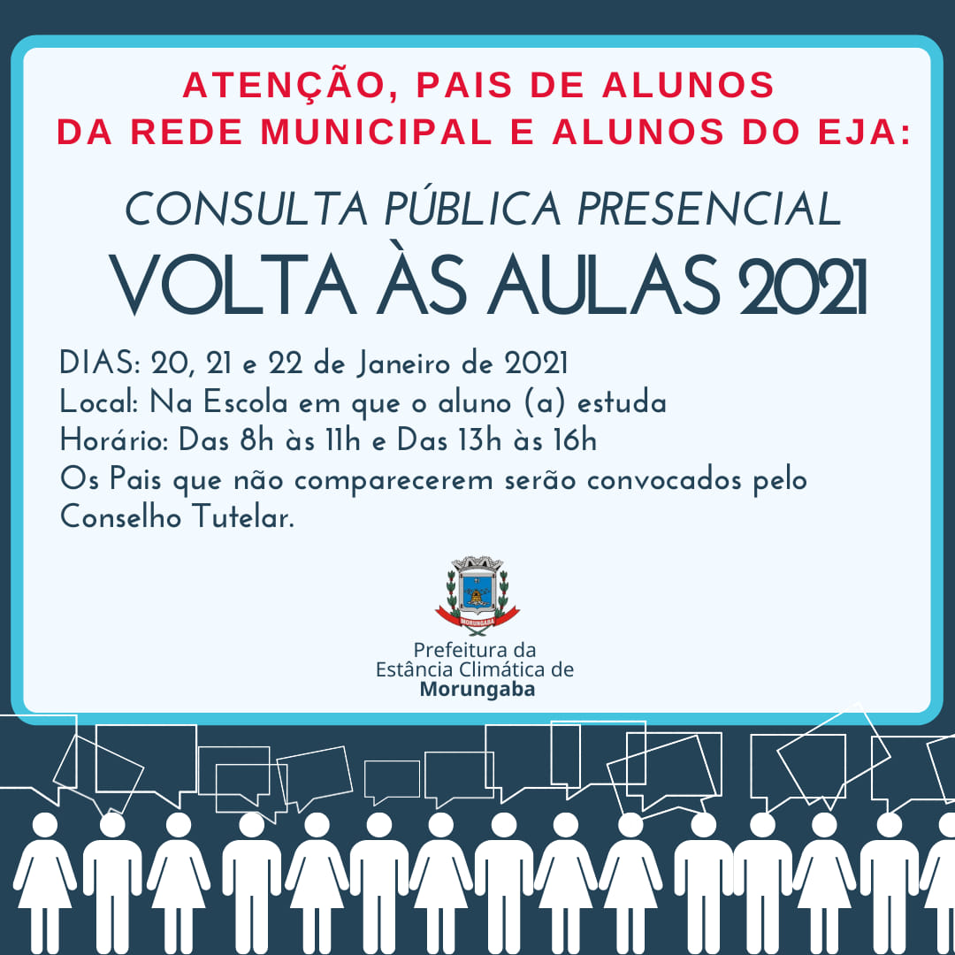 A Prefeitura de Morungaba por meio do Departamento de Educação, seguindo orientação do Governo Estadual, que determina o retorno das Aulas Presenciais, prevista para o dia 8/2/2021 na rede municipal, convoca pais e responsáveis por alunos da rede municipal e a alunos da EJA (Educação de Jovens e Alunos) a responderem uma Consulta Pública conforme o cronograma abaixo: