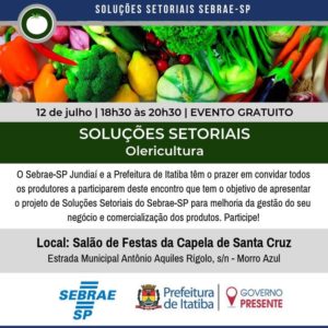 Respeitando o cronograma 2019 de palestras voltadas para os produtores rurais e profissionais da agricultura, a Prefeitura de Itatiba em parceria com o Sebrae-SP oferecerá no próximo dia 12 de Julho a apresentação do projeto de Soluções Setoriais do Sebrae- SP.
