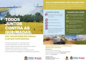 “Praticar queimadas é algo absurdo, principalmente nesta época do ano. É um crime ambiental. Com o tempo seco, elas podem se alastrar e sair de controle, provocando grandes danos ambientais e à saúde. Os servidores públicos dos Bombeiros, Defesa Civil, Secretaria de Obras se desdobram para conter os focos que surgem”, destacou o prefeito Douglas Augusto. “Todos já estão em uma luta diária contra a Covid-19, então pedimos a ajuda da população para que acione os Bombeiros e denuncie assim que perceber um foco de incêndio, para que inclusive os responsáveis sejam autuados”, concluiu.