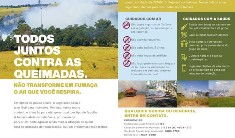 “Todos juntos contra as queimadas. Não transforme em fumaça o ar que você respira”. É com este lema que a Prefeitura de Itatiba lança uma campanha contra as queimadas em todo o município. Em época de pouca chuva, a vegetação seca é alvo fácil para incêndios. A fumaça afeta diretamente os pulmões e, por conta da Covid-19, pode agravar ainda mais a situação de possíveis pacientes em recuperação ou que possuam outros problemas respiratórios.