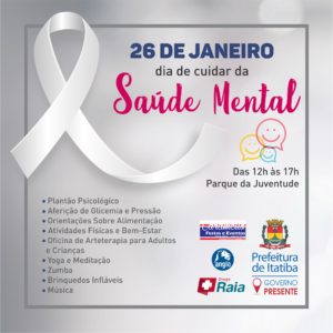No domingo (26), a Prefeitura de Itatiba por meio da Secretaria de Saúde promove no Parque da Juventude o Dia de Cuidar da Saúde Mental. A ação tem o objetivo de chamar a atenção de toda a população para cuidar da saúde mental adotando um estilo de vida emocionalmente mais leve e saudável.
