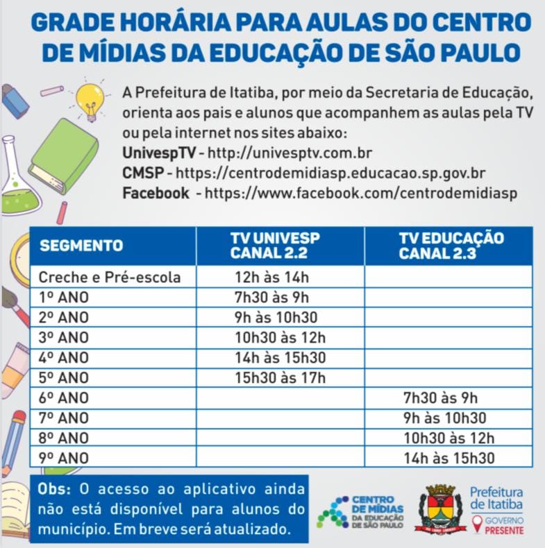 Começou a funcionar nesta segunda-feira, 27, o programa de aulas do Centro de Mídias da Educação de São Paulo (CMSP). A Secretaria da Educação da Prefeitura de Itatiba orienta aos pais e alunos que desde já acompanhem a programação. As aulas serão transmitidas a partir de estúdios de TV instalados na sede da Escola de Formação dos Profissionais da Educação (EFAPE) e podem ser acompanhadas, ao vivo, pelos canais da TV aberta: TV Univesp (2.2) e TV Educação (2.3).
