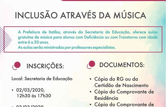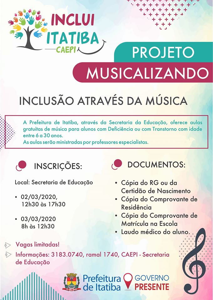 A Prefeitura de Itatiba, por meio da Secretaria de Educação, abre na próxima segunda (02), as inscrições para o Projeto Musicalizando. Iniciado em janeiro de 2019, o programa tem o objetivo de oferecer aulas de musicalização para pessoas com deficiência intelectual.