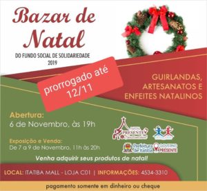 Prorrogado Bazar de Natal do FSS até esta terça-feira, da 12/11 novembro 10, 2019admin No Itatiba Mall, até esta terça-feira, dia 12, você pode encontrar peças lindas para presentear seus amigos e familiares. Aproveite!