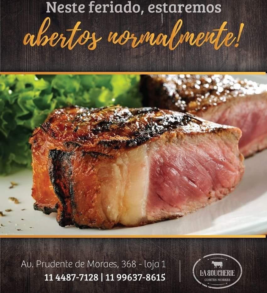 Já garantiu seu almoço e da sua família para amanhã? Nesta sexta-feira (12) feriado, Dia da Padroeira do Brasil Nossa Senhora Aparecida e Dia das Crianças, a La Boucherie estará de portas abertas com carnes deliciosas para seu churrasco completo!