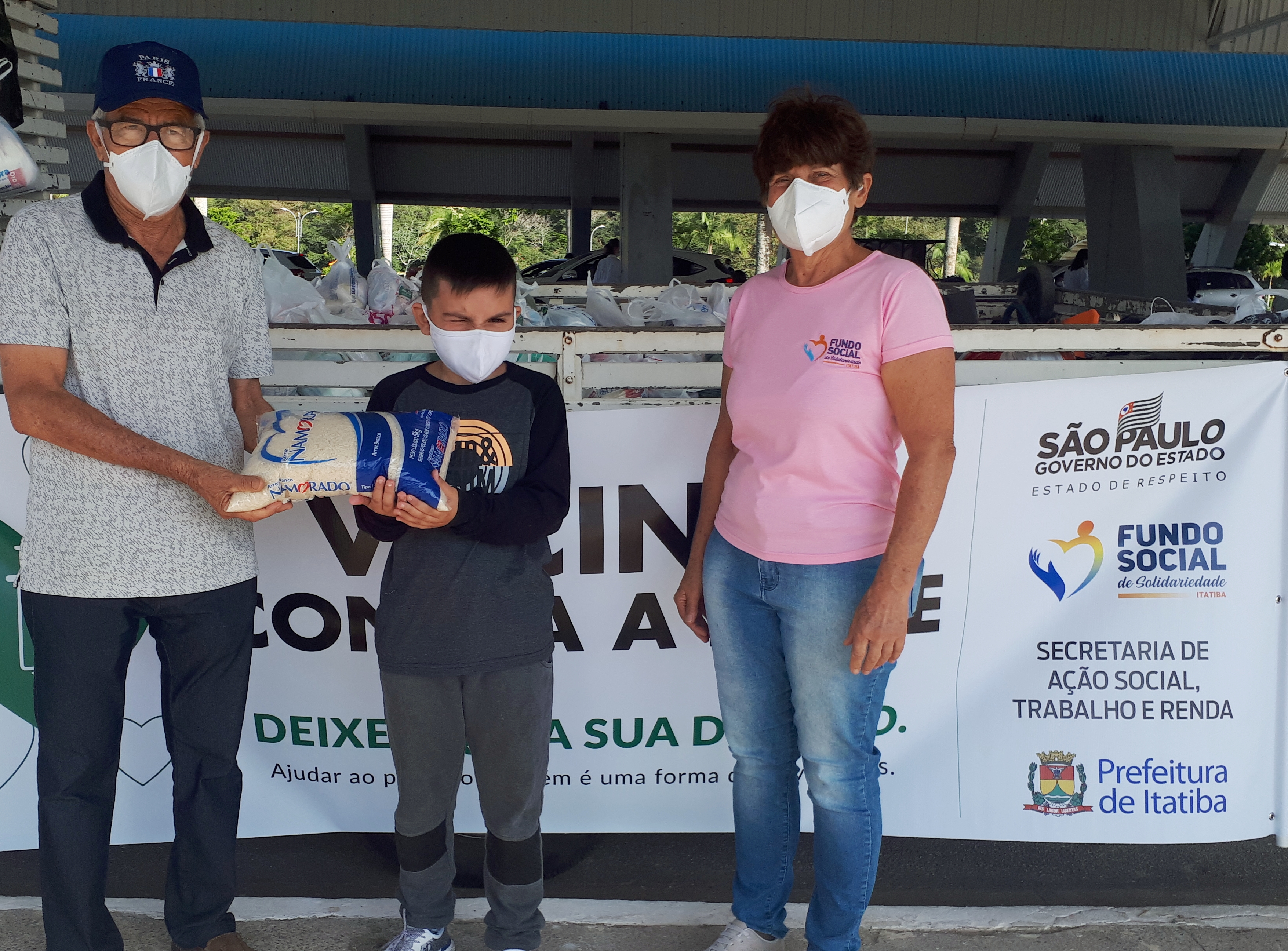 No apoio, o Fundo Social de Solidariedade contou com um posto para arrecadação de alimentos e ração para animais. O garoto Miguel Degani doou um pacote de 5 kg de arroz. Na foto, com o vice-prefeito de Itatiba Mauro Delforno e Rosa Paladino Delforno. (Foto Dani Marzano)