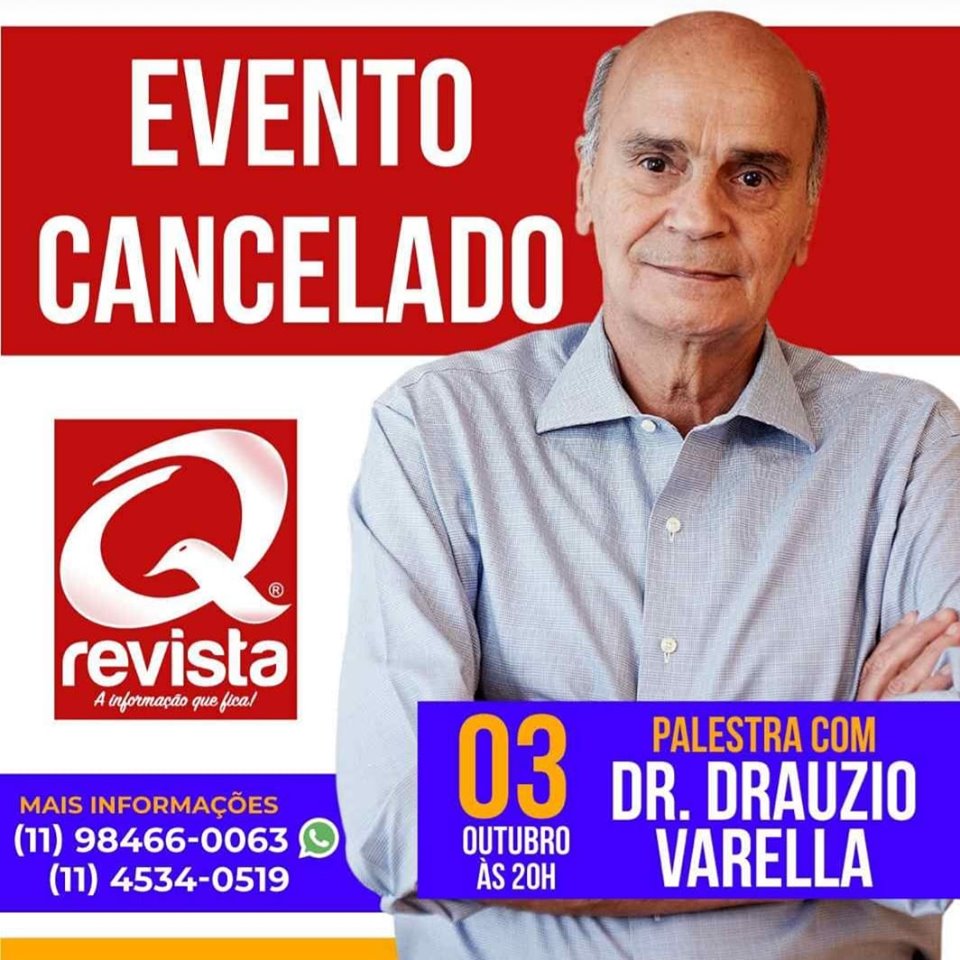 “Nós da Q Revista, sempre com o intuito de levar informação de qualidade ao nosso público, organizamos uma palestra com o Dr Drauzio Varella, com o tema “Qualidade de Vida”. Entretanto, devido à baixa busca por ingressos, não conseguiremos dar continuidade ao evento. Empenhamos todos os nossos recursos e esforços para que a palestra fosse realizada da melhor maneira possível,mas infelizmente não tivemos o retorno esperado. Dessa maneira, informamos que o evento do dia 03 de outubro foi cancelado. O ressarcimento será feito até dia 04/10, sexta-feira”.
