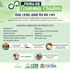 A população de Itatiba tem uma boa opção de passeio para o próximo sábado, 14/05, quando acontece mais uma edição da Feira de Economia Criativa. O evento será realizado no Centro de Educação Ambiental de Itatiba (CEAI), das 9h às 14h.