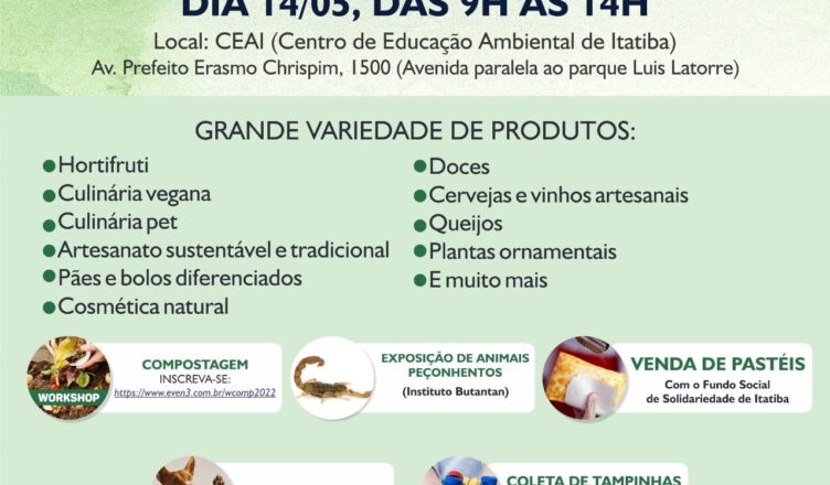 Será realizada uma exposição de animais peçonhentos do Instituto Butantã, que faz parte do acervo do CEAI. Também será realizado o workshop sobre compostagem. O link para inscrição é o www.even3.com.br/wcomp2022. A participação é gratuita.