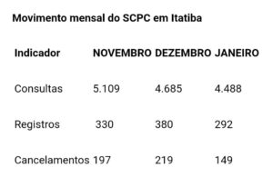 Outra queda foi observada no índice de cancelamentos, referente aos que pagaram suas dívidas e tiveram o nome retirado do SCPC. Em dezembro foram 219. Em janeiro, 149 obtiveram esta conquista. A diminuição é de 31,9%.