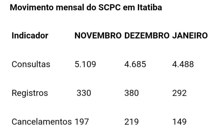 Outra queda foi observada no índice de cancelamentos, referente aos que pagaram suas dívidas e tiveram o nome retirado do SCPC. Em dezembro foram 219. Em janeiro, 149 obtiveram esta conquista. A diminuição é de 31,9%.