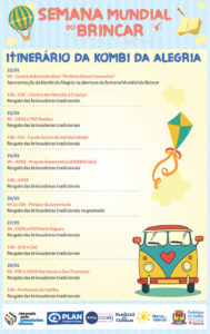 Outra grande atração desta edição da Semana Mundial do Brincar em Itatiba é a “Kombi da Alegria”, um veículo que percorrerá diversos pontos da cidade como Centro de Atenção à Criança, PSF, CRAS, APAE, Parque da Juventude e Prefeitura levando muita diversão além de promover o resgate de brincadeiras tradionais. A programação completa da “Kombi da Alegria” segue em anexo.