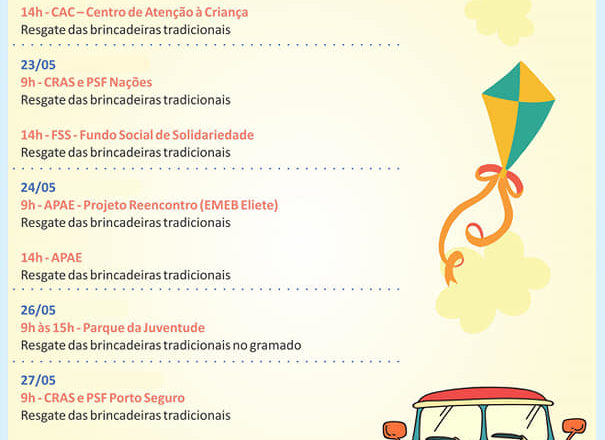 – Dia do Brincar: apresentações artísticas, oficinas, brinquedos infláveis, maquiagem artística, praça de alimentação, copa da amizade, doação de mudas, feira de troca de brinquedos, pipoca e muito mais!