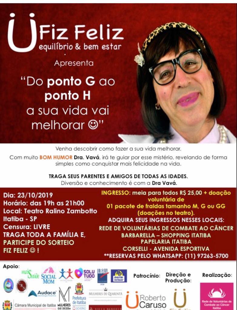 Com realização da Rede de Voluntárias de Combate ao Câncer de Itatiba, na próxima quarta-feira, dia 23/10, você terá um encontro marcado com sua parte mais bem humorada, afinal onde há bom humor a vida vai a seu favor. Convide os amigos e venha desfrutar de momentos cheios de conhecimento e descontração e lembre-se “Rir faz bem ao coração e rejuvenesce” . É o stand up com Roberto Caruso , a Dra Vavá , “ Do Ponto G ao Ponto H a sua Vida vai Melhorar”.