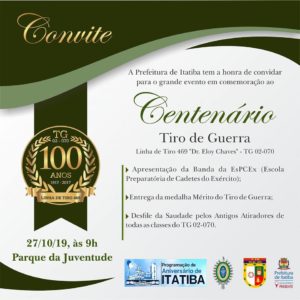 As comemorações dos 162 anos do Aniversário de Itatiba vão contar com um evento especial do TG 02-070, que também está em festa: são 100 anos do reconhecimento da linha de Tiro 469-Dr Eloy Chaves, atual Tiro de Guerra 02-070. E para lembrar a data, no próximo dia 27 de outubro, uma Solenidade Militar será realizada a partir das 9h no Parque do Juventude. A cerimônia também terá por finalidade comemorar o Dia do Antigo Atirador, com descerramento da placa alusiva ao Centenário, a entrega da Medalha “Mérito do Tiro de Guerra” e homenagem às turmas de 1957 a 1960.