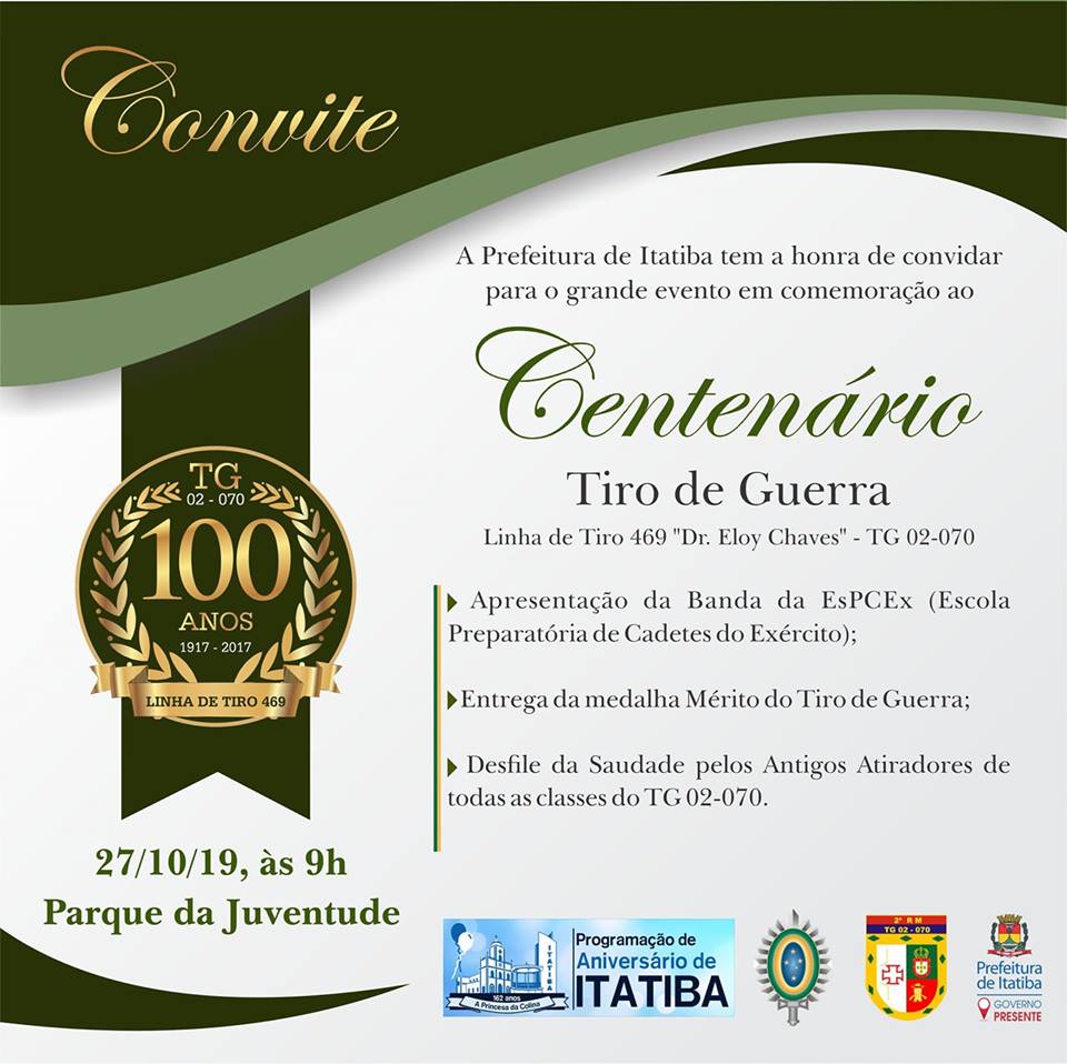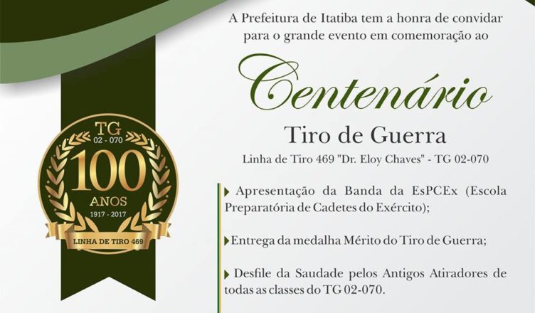 As comemorações dos 162 anos do Aniversário de Itatiba vão contar com um evento especial do TG 02-070, que também está em festa: são 100 anos do reconhecimento da linha de Tiro 469-Dr Eloy Chaves, atual Tiro de Guerra 02-070. E para lembrar a data, no próximo dia 27 de outubro, uma Solenidade Militar será realizada a partir das 9h no Parque do Juventude. A cerimônia também terá por finalidade comemorar o Dia do Antigo Atirador, com descerramento da placa alusiva ao Centenário, a entrega da Medalha “Mérito do Tiro de Guerra” e homenagem às turmas de 1957 a 1960.