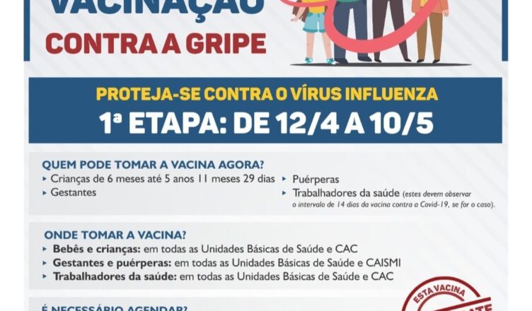 A vacina contra gripe protege contra infecções respiratórias causadas pelo vírus Influenza, que acomete o aparelho respiratório, podendo evoluir para doenças mais perigosas, como a pneumonia. A campanha de vacinação contra gripe é coordenada nacionalmente pelo Ministério da Saúde e tem duração de quatro meses, dividida em três etapas. A próxima etapa prevista deverá atender idosos e professores, a partir de 11/05. E em junho passam a ser vacinados contra gripe para demais públicos.
