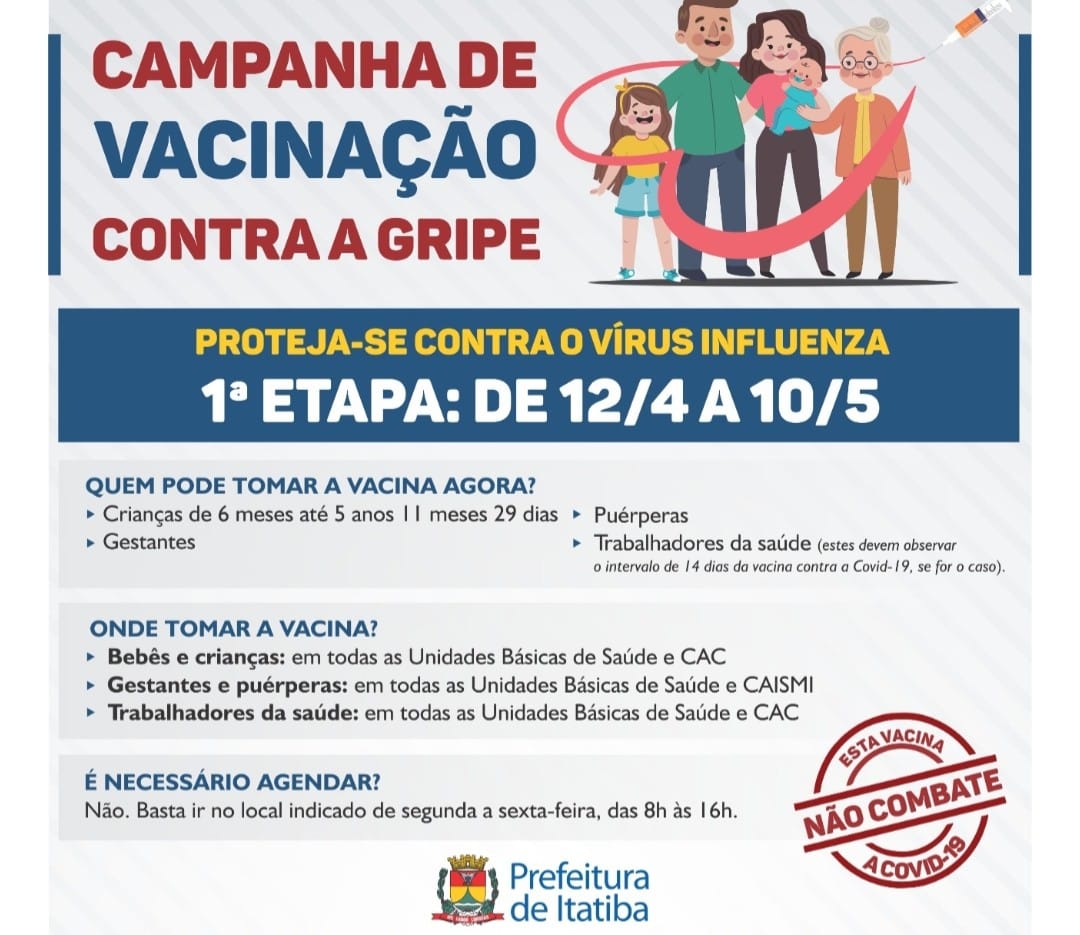 Começa na segunda-feira, 12/04, a campanha de vacinação contra a gripe causada pelo vírus Influenza, realizada pela Prefeitura de Itatiba por meio da Secretaria da Saúde. As doses estarão disponíveis nas sete UBS’s (Unidades Básicas de Saúde) e 15 postos de Estratégia de Saúde da Família (ESF’s) de toda rede pública municipal, além do CAC – Centro de Atenção à Criança e CAISMI – Centro de Atenção Integral à Saúde da Mulher, no período das 08h às 16h, de segunda a sexta-feira. Não é necessário agendar.