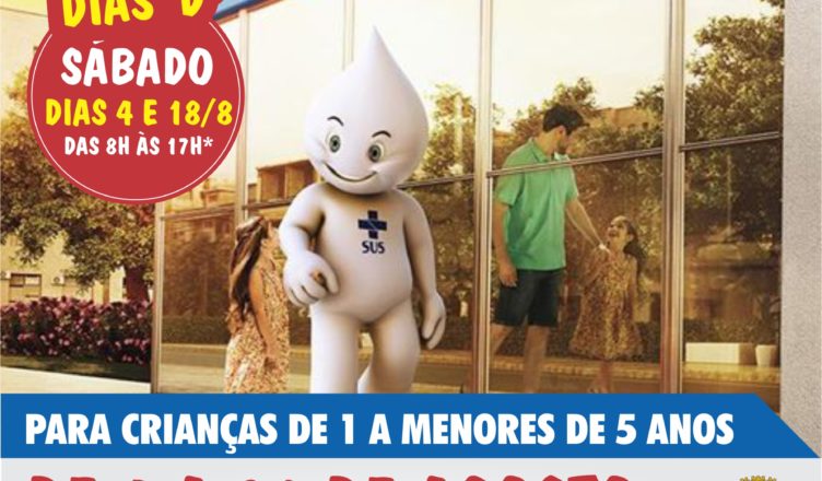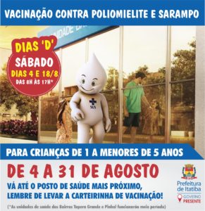 Começa no dia 04 de agosto a campanha de vacinação contra a poliomielite e o sarampo. Este ano como novidade, a Secretaria de Saúde programou dois “Dias D”, o primeiro acontecendo no dia 04, abrindo a campanha e o segundo no dia 18.
