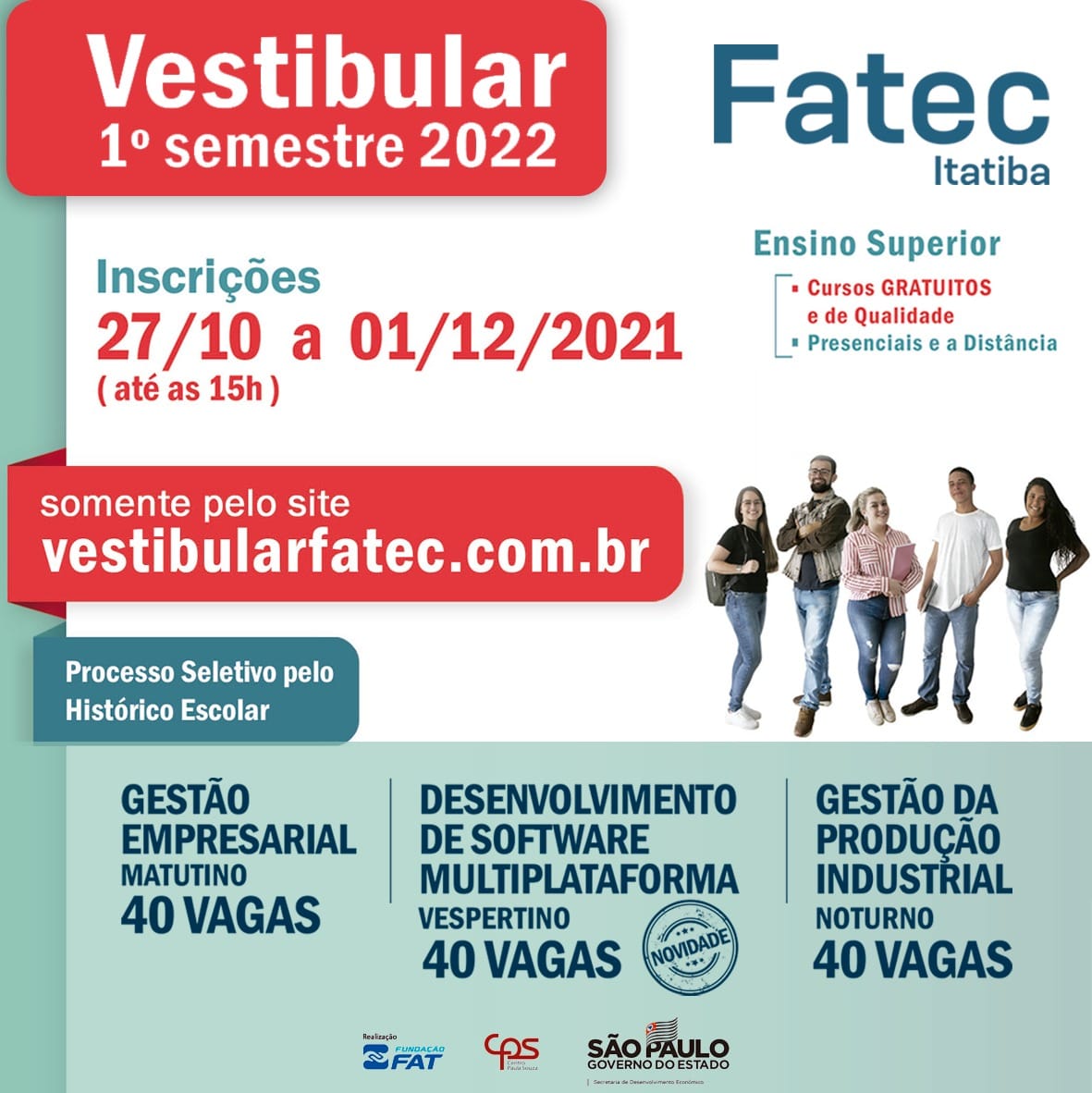 Somos uma Faculdade Pública, ou seja, Gratuita! Venha fazer parte da Fatec de Itatiba e ser o profissional que o mundo do trabalho procura! Não perca a chance de fazer seu curso superior GRATUITO e de QUALIDADE! Nesse semestre o Vestibular será pela análise das notas do seu histórico escolar do ensino médio!!!
