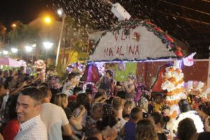 “A gente fica muito feliz porque eu e a Mayara sempre gostamos muito de Natal. E é algo que a gente descobriu que não existe em outras cidades, como aqui, a tradição de jogar balas. Então a gente resolveu dar um valor maior ao Natal até por se tornar um evento turístico. Mandamos um projeto de lei pra Câmara, tornando a chegada do Papai Noel um evento oficial do município, concedemos três toneladas de balas e está chegando mais três toneladas agora para os mais de 40 Papais Noeis que fazem festa pela cidade, entre eles o Beto e o Luizão”, afirmou o Prefeito Douglas Augusto.