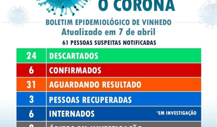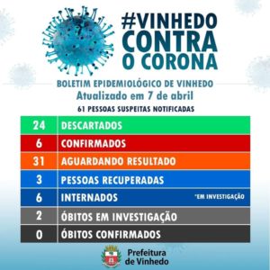 Vinhedo registrou também as 2 primeiras mortes suspeitas da Covid-19 na cidade. O primeiro caso é de um homem de 68 anos, que estava internado na Santa Casa e faleceu ontem no início da noite. A notificação como caso suspeito era de 22 de março. O segundo caso é de uma mulher de 77 anos, que estava internada na Santa Casa desde 1º de abril. Ela faleceu nesta terça-feira, 7. Ambos eram portadores de doenças crônicas pré-existentes. A Prefeitura aguarda resultado de exame para confirmar se eles tinham Covid-19.